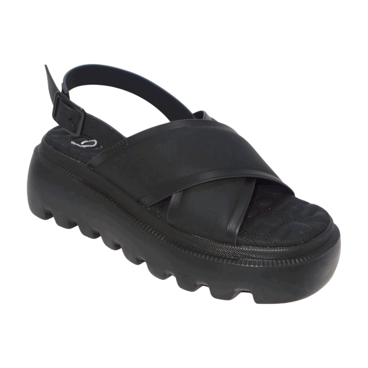 Sandalo donna by byblos in ecopelle nero con fascia a incrocio e chiusura cinturino posteriore regolabile. Sottopiede morbido in comfort foam logato a rilievo. Fondo gomma platform altezza 5.5 cm circa