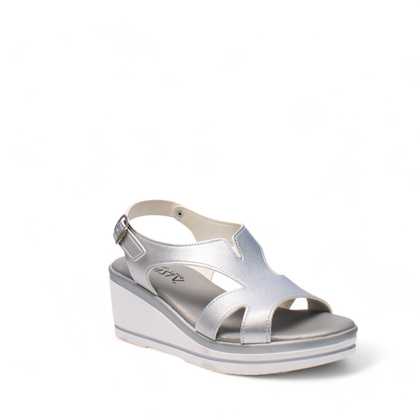 Sandalo Cinzia Soft in ecopelle effetto lamé argento con fascione e chiusura cinturino posteriore con fibbia regolabile. Sottopiede in memory foam, fondo zeppa bicolor in gomma altezza 6 cm.