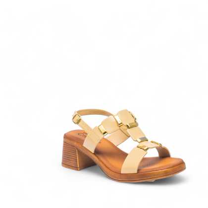 Sandalo Cinzia Soft in ecopelle beige a due fasce con inserti metallici oro. Chiusura cinturino posteriore regolabile. Sottopiede morbido, altezza tacco 6 cm.