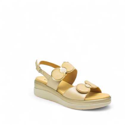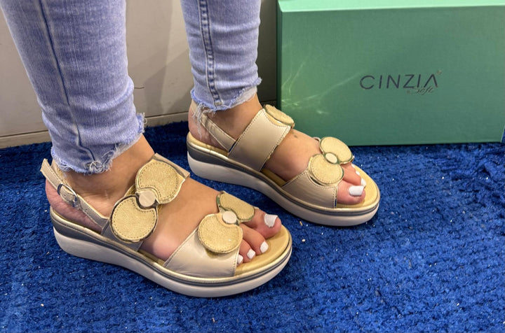 Sandalo Cinzia Soft in pelle beige perlato a due fasce regolabili con velcro e dettagli in camoscio beige. Chiusura posteriore con cinturino regolabile. Plantare in memory estraibile, fondo zeppa in gomma altezza 4.5 cm