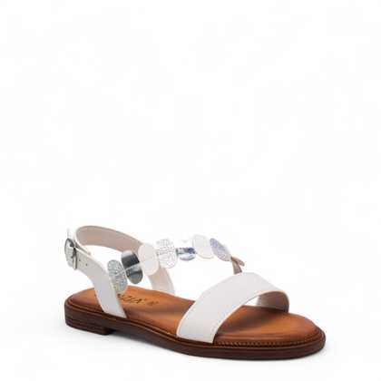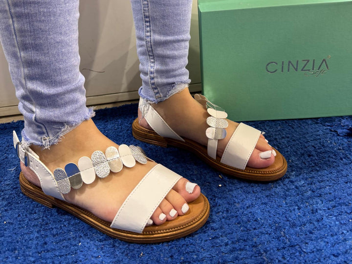 Sandalo flat Cinzia Soft in ecopelle bianca con fascia orizzontale total white e fascia laterale con applicazioni argento lamé e lurex. Chiusura cinturino posteriore regolabile. Sottopiede morbido, tacco a blocchetto altezza 2 cm.
