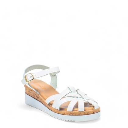 Sandalo a granchio Cinzia Soft in pelle bianca, chiusura cinturino alla caviglia regolabile. Sottopiede pelle in memory, fondo zeppa con inserto sughero altezza 5 cm.
