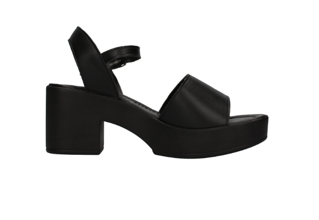 Sandalo Cinzia Soft in pelle total black a una fascia. Chiusura cinturino regolabile alla caviglia. Sottopiede in pelle in memory foam, altezza tacco 7 cm, altezza plateau 2.5 cm