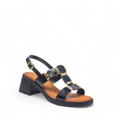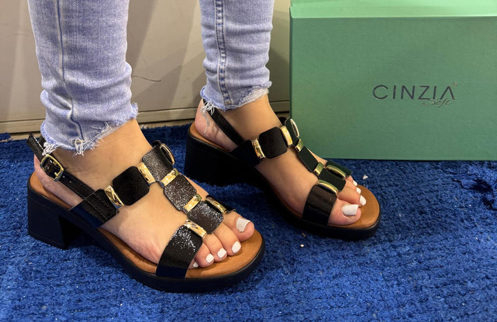 Sandalo Cinzia Soft in ecopelle nera a due fasce con inserti metallici oro. Chiusura cinturino posteriore regolabile. Sottopiede morbido, altezza tacco 6 cm.