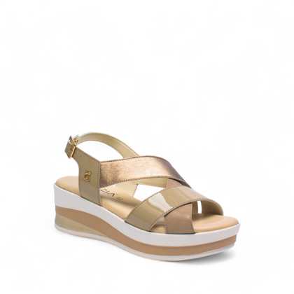 Sandalo Cinzia Soft in pelle dalle sfumature fango e oro con fascia a incrocio multimateriale. Chiusura cinturino posteriore con fibbia regolabile. Sottopiede in pelle in memory foam, fondo zeppa bicolor in gomma altezza 5.5 cm.