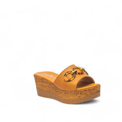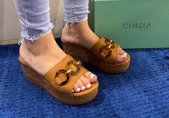 Ciabatta Cinzia Soft a una fascia in pelle color cuoio con applicazione effetto tartarugato. Sottopiede morbido in pelle, fondo zeppa in sughero altezza 6.5 cm e plateau altezza 3.5 cm