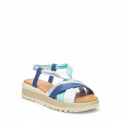 Sandalo Cinzia Soft in morbida pelle multicolor blu e bianca con fasce a incrocio. Cinturino posteriore elastico, sottopiede pelle in memory. Fondo zeppa bicolor altezza 4 cm.