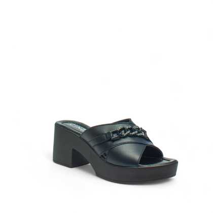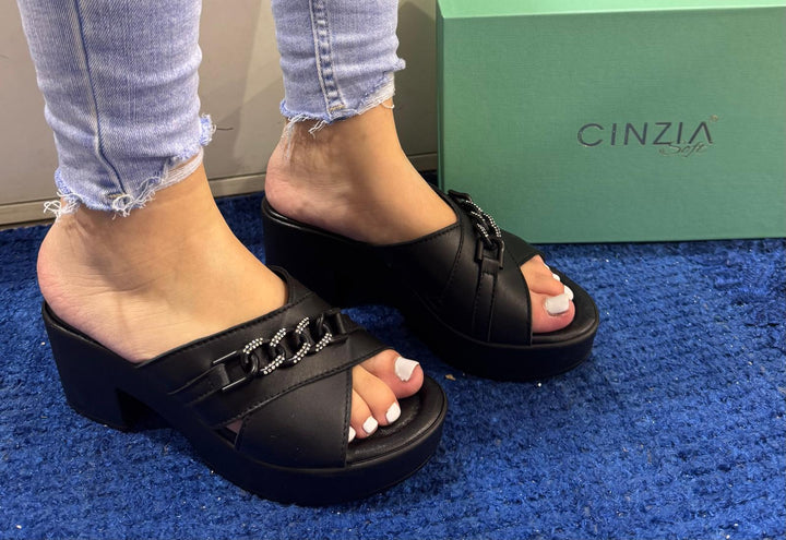 Sandalo con tacco Cinzia Soft con fasce a incrocio in pelle nera con applicazione catena. Sottopiede memory in pelle, altezza tacco 7 cm, plateau altezza 2.5 cm