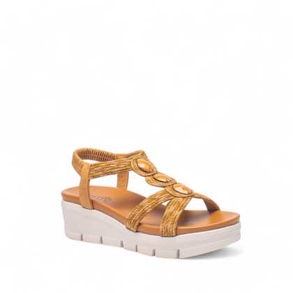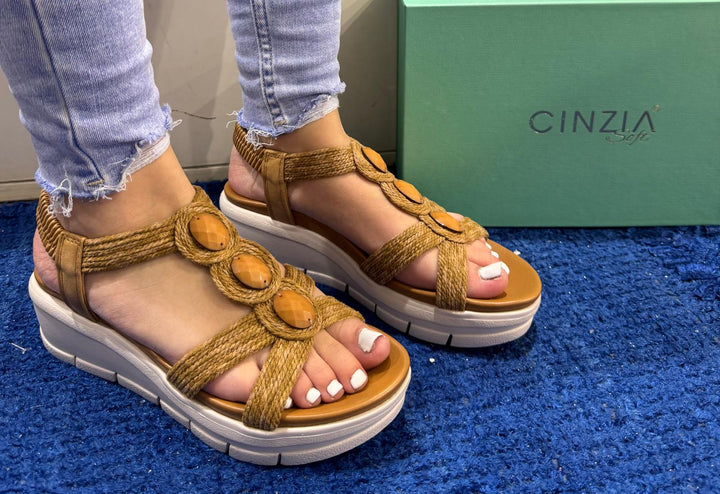 Sandalo Cinzia Soft in ecopelle nude/beige con fasce in corda e applicazione pietre dure in tinta. Cinturino posteriore elastico, sottopiede in memory. Fondo zeppa altezza 5 cm.