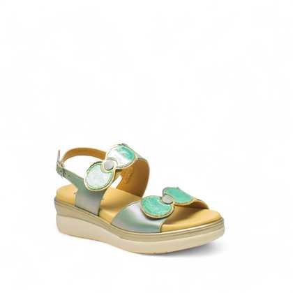 Sandalo Cinzia Soft in pelle verde perlato a due fasce regolabili con velcro e dettagli lamé salvia. Chiusura posteriore con cinturino regolabile. Plantare in memory estraibile, fondo zeppa in gomma altezza 4.5 cm