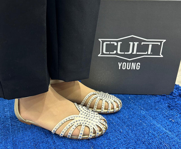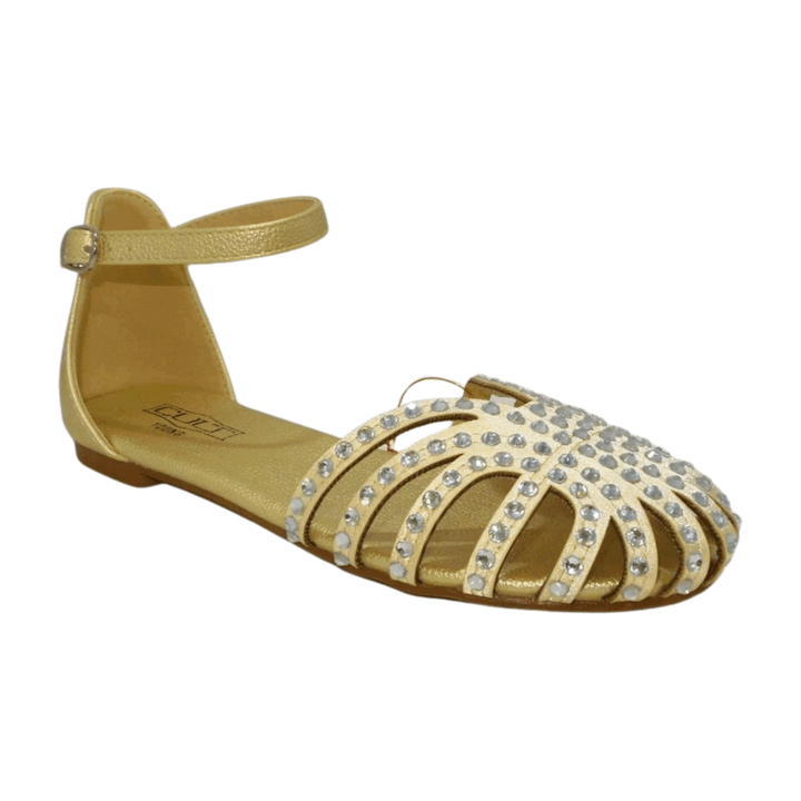 Sandalo flat a granchio Cult Young in ecopelle oro. Chiusura con cinturino alla caviglia, applicazione strass sulla punta, tallone coperto, sottopiede morbido. Fondo gomma, tacco a blocchetto altezza 1 cm.