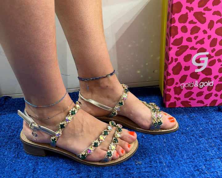 Sandalo gold&gold in ecopelle oro con applicazioni strass e pietre dure sulle fascette, sottopiede in pelle. Chiusura con cinturino posteriore regolabile, tacco a blocchetto altezza 4 cm.