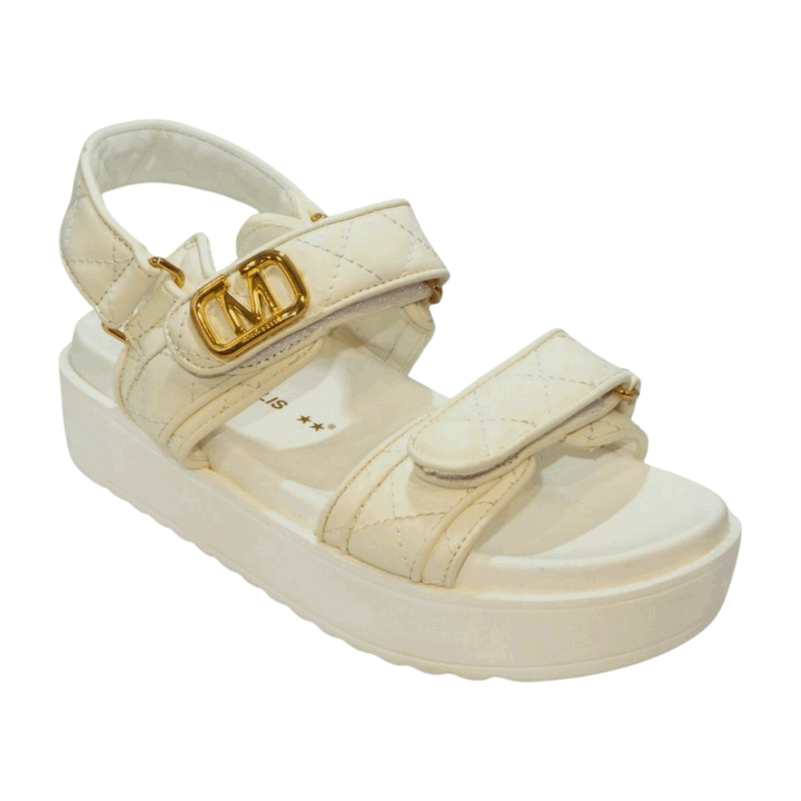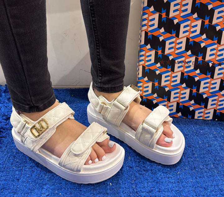 Sandalo donna Marc Ellis in ecopelle bianca a due fasce regolabili con placchetta logo dorata e cinturino fisso posteriore. Sottopiede morbido, fondo in gomma platform altezza 5.5 cm