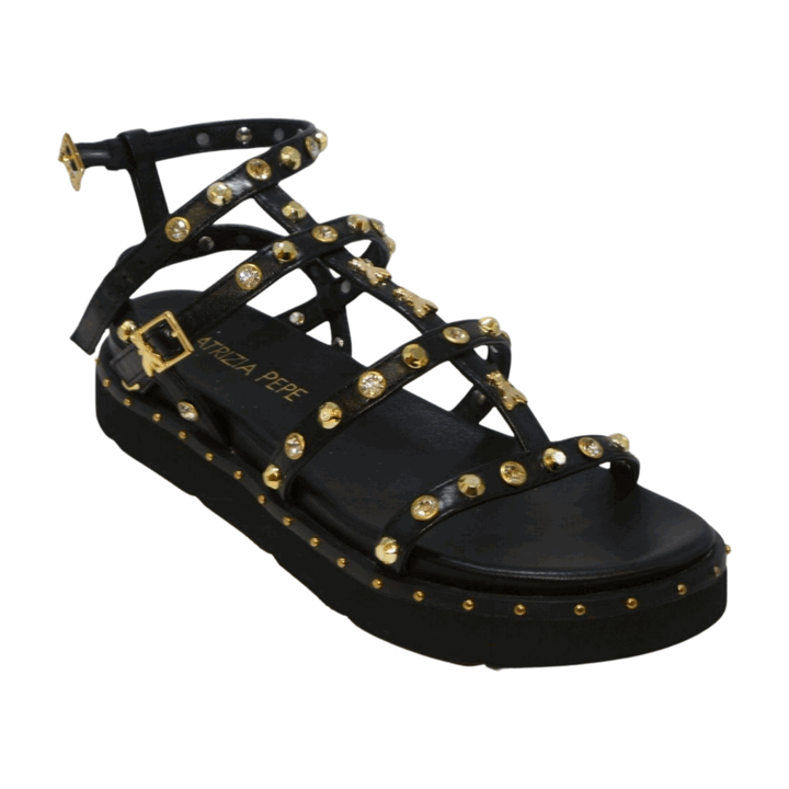 Sandalo alla schiava Patrizia Pepe in pelle nero con applicazione borchie e punti luce sulle fasce. Inserto loghi metallici oro, chiusura doppio cinturino con fibbie regolabili. Sottopiede comfort foam in pelle, fondo in gomma platform altezza 4 cm.