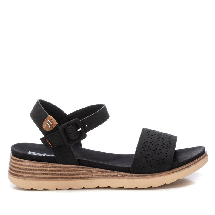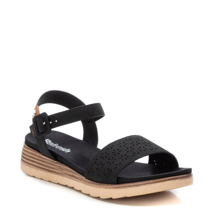 Sandalo Refresh in ecopelle scamosciata nera con fascia orizzontale laserata e chiusura cinturino regolabile alla caviglia. Sottopiede in ecopelle in comfort foam, fondo zeppetta bicolor altezza 3.5 cm