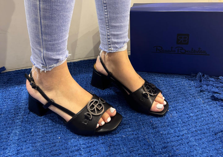 Sandalo donna Renato Balestra in ecopelle nero con applicazione logo silver sulla fascia. Chiusura con cinturino posteriore regolabile, sottopiede morbido in pelle. Tacco a blocchetto altezza 6.5 cm