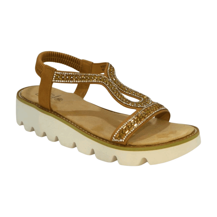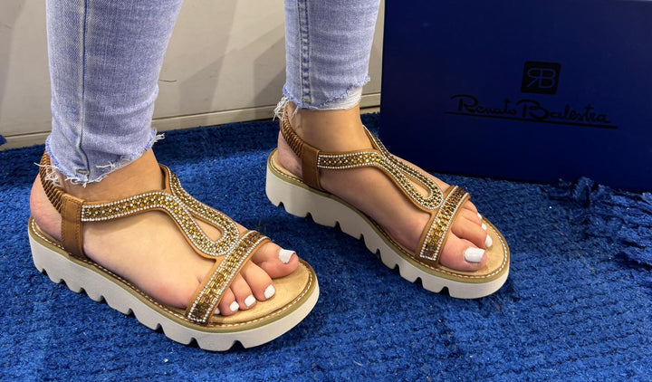 Sandalo donna Renato Balestra in ecopelle color cuoio con perline in tinta sulle fasce. Cinturino elastico alla caviglia, sottopiede comfort foam, fondo zeppetta leggero in gomma altezza 4 cm.