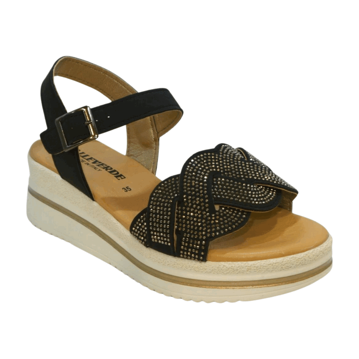 Sandalo donna Valleverde in ecopelle nero a una fascia orizzontale intrecciata ricoperta di strass. Chiusura con cinturino regolabile alla caviglia, sottopiede in pelle comfort foam. Fondo zeppa platform altezza 4.5 cm