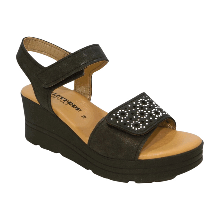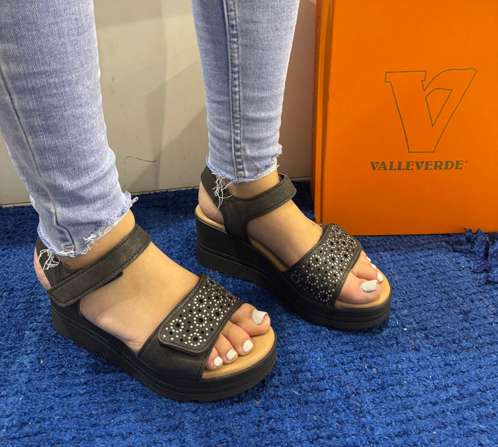 Sandalo donna Valleverde in ecopelle nero con fascia orizzontale laserata con strass regolabile. Chiusura cinturino alla caviglia regolabile con velcro, sottopiede in pelle comfort foam. Fondo zeppa altezza 6 cm.