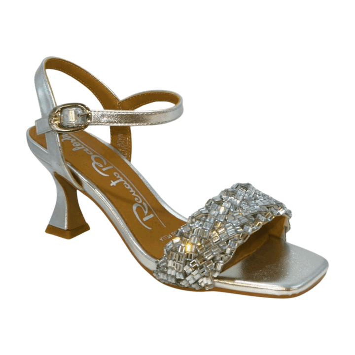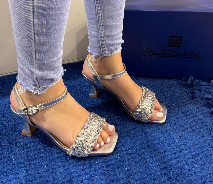 Sandalo donna Renato Balestra in ecopelle silver con applicazione cristalli in tinta sulla fascia. Chiusura con cinturino regolabile alla caviglia, sottopiede morbido in pelle. Tacco a rocchetto altezza 8 cm.