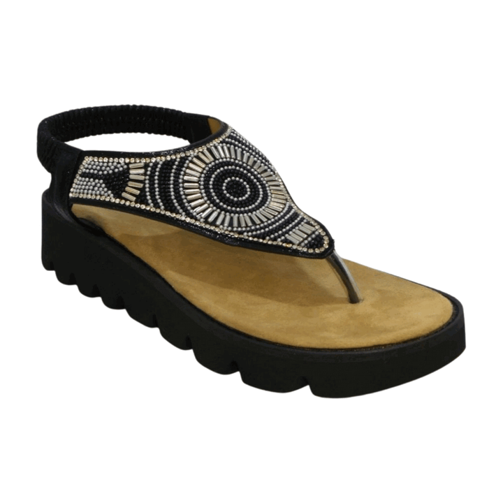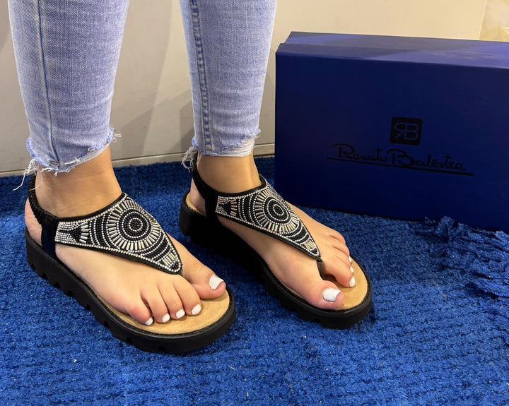Sandalo infradito donna Renato Balestra in ecopelle nero con perline in tinta sulla fascia. Cinturino elastico alla caviglia, sottopiede comfort foam, fondo zeppetta leggero in gomma altezza 4 cm.