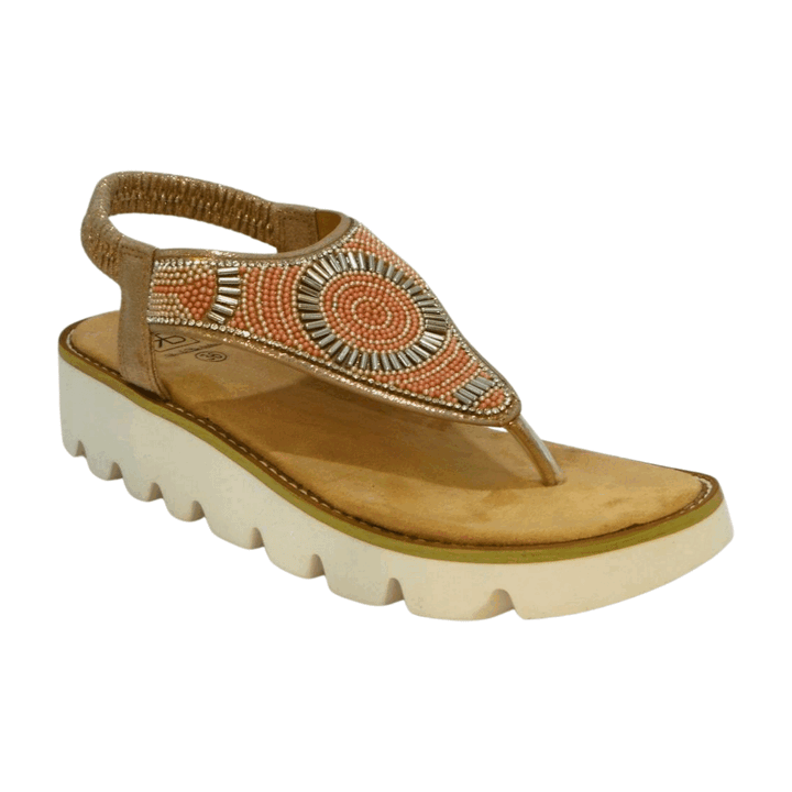 Sandalo infradito donna Renato Balestra in ecopelle rosegold con perline in tinta sulla fascia. Cinturino elastico alla caviglia, sottopiede comfort foam, fondo zeppetta leggero in gomma altezza 4 cm.