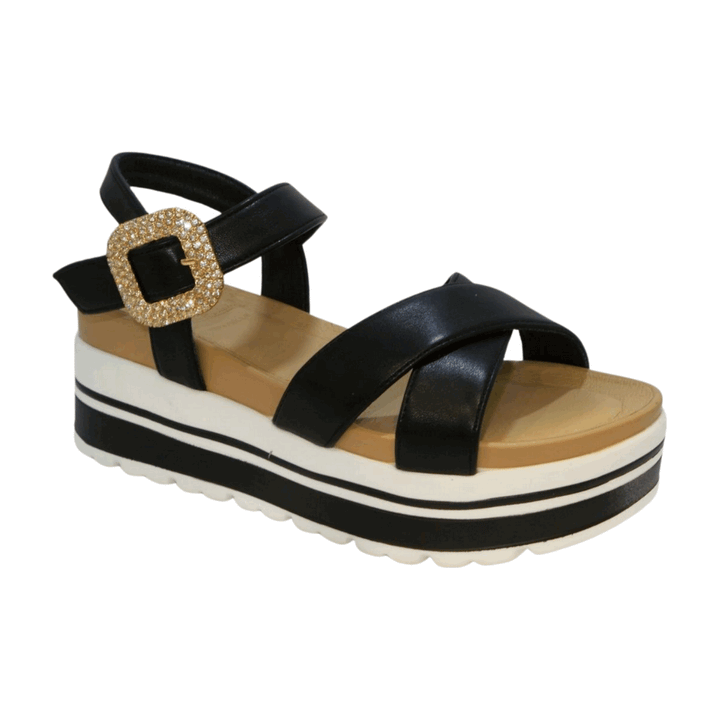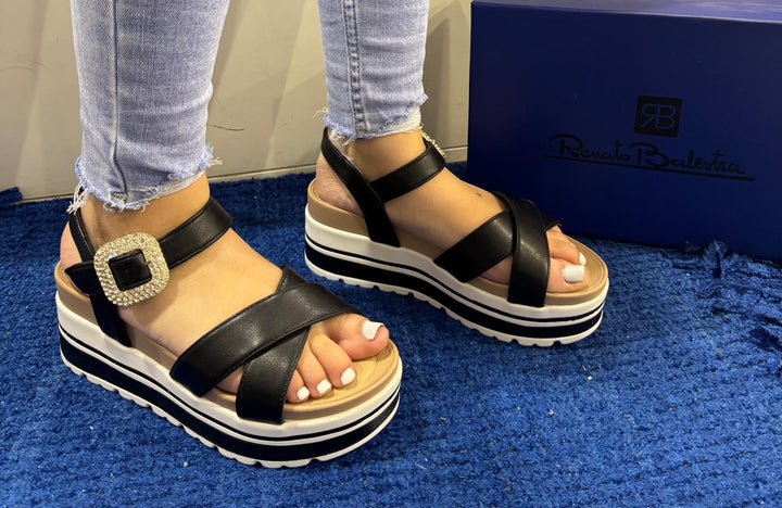 Sandalo Renato Balestra in ecopelle nero con fascette a incrocio e chiusura cinturino alla caviglia con fibbia gioiello. Sottopiede morbido in pelle, fondo zeppa platform bicolor altezza 6 cm.