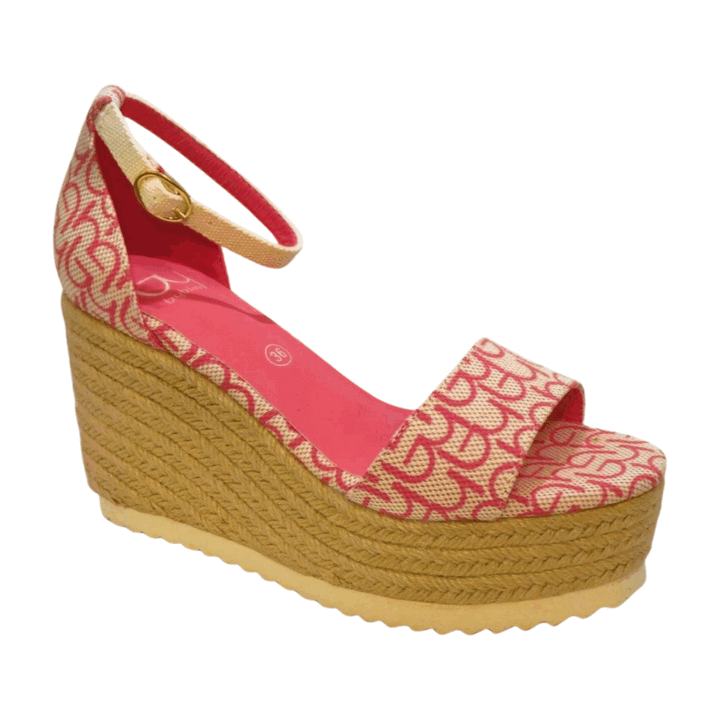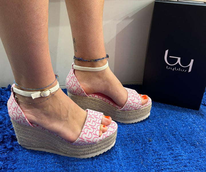 Sandalo by byblos in tessuto logato rosa e inserti beige. Fascia orizzontale e chiusura cinturino alla caviglia con tallone coperto. Sottopiede morbido in pelle, fondo zeppa ultra light rivestito in corda altezza 10 cm