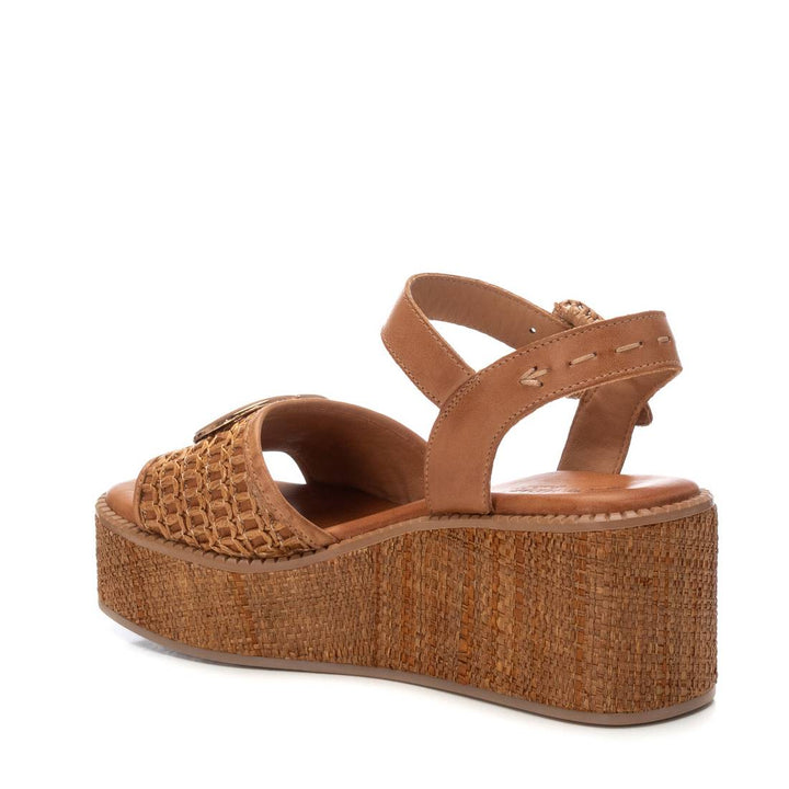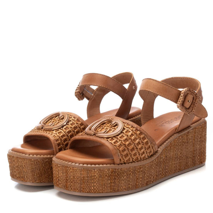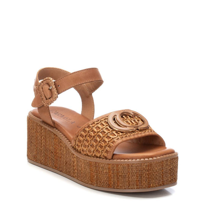 Sandalo zeppa Carmela in pelle effetto corda camel. Chiusura con cinturino alla caviglia, applicazione fibbia con logo sulla fascia anteriore. Sottopiede morbido, fondo zeppa altezza 6.5 cm e plateau 3.5 cm