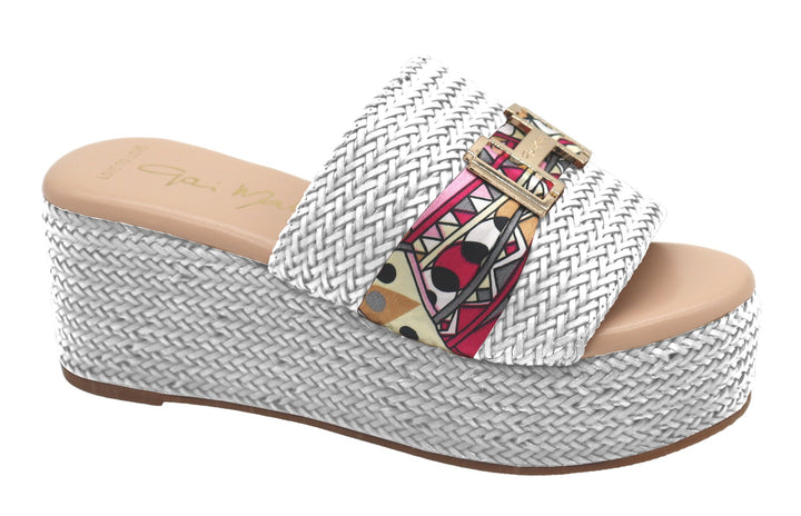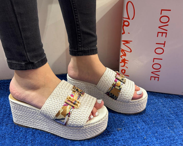 Scalzato donna Love to Love Gai Mattiolo in ecopelle intrecciata bianca con inserto fibbia logata e tessuto multicolor sulla fascia. Plantare in pelle comfort foam, fondo zeppa con intreccio altezza 8 cm.