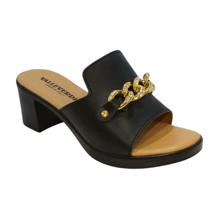 Scalzato Valleverde in ecopelle nero con applicazione catena oro sul fascione. Sottopiede morbido in pelle, tacco a blocchetto altezza 6 cm.