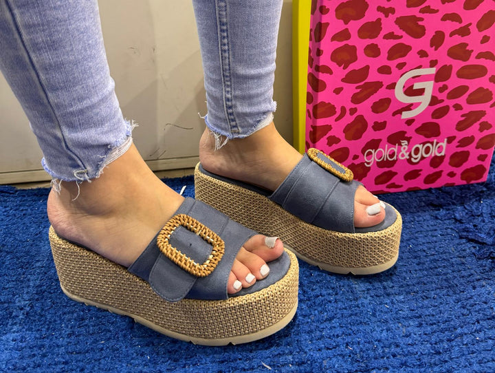 Scalzato gold&gold in ecopelle scamosciata carta da zucchero con inserto fibbia sulla fascia. Sottopiede morbido in pelle, zeppa in corda altezza 7.5 cm