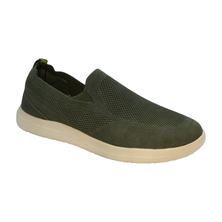 Slip-on uomo Jeep in tessuto elastico verde military effetto calza. Plantare removibile comfort foam, calza facile posteriore. Fondo gomma flex ultra light altezza 3 cm.