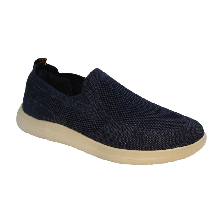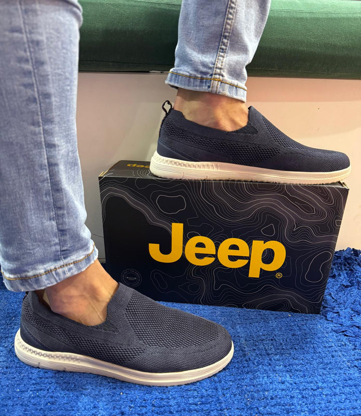 Slip-on uomo Jeep in tessuto elastico blu navy effetto calza. Plantare removibile comfort foam, calza facile posteriore. Fondo gomma flex ultra light altezza 3 cm.