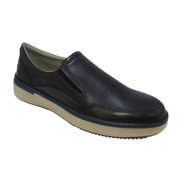 Slip-on uomo Valleverde in pelle effetto laserato blu navy. Tomaia interna e plantare removibile in pelle. Fondo gomma ultra light altezza 3 cm.