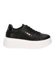 Sneakers donna 4US by Cesare Paciotti in ecopelle nera e dettagli in vernice. Chiusura con lacci piatti in cotone in tinta e mini logo metallico laterale oro. Linguetta e talloniera logate. Sottopiede morbido in pelle, fondo in gomma altezza 5 cm.