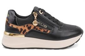Sneakers donna 4US by Cesare Paciotti in pelle nera e dettagli leopard. Inserti in vernice in tinta e in tessuto effetto lamé. Chiusura con lacci piatti in cotone in tinta e zip sul laterale esterno. Linguetta e talloniera logate, spoiler posteriore cromato oro. Sottopiede morbido in pelle, fondo gomma ultra light altezza 3.5 cm