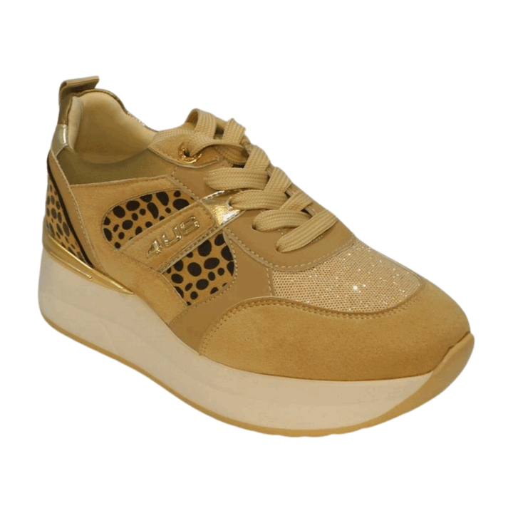 Sneakers donna 4US by Cesare Paciotti in ecocamoscio camel e animalier. Inserti in ecopelle platino e bright mesh, logo laterale oro. Chiusura con lacci piatti in cotone in tinta, linguetta logata e calza facile. Spoiler posteriore cromato oro, sottopiede morbido in pelle. Fondo platform in gomma altezza 4 cm.