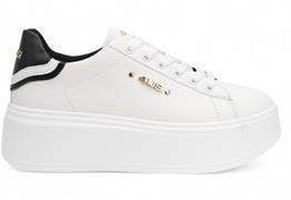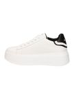 Sneakers donna 4US by Cesare Paciotti in ecopelle bianca e dettagli a contrasto neri. Chiusura con lacci piatti in cotone in tinta e mini logo metallico laterale oro. Linguetta e talloniera logate. Sottopiede morbido in pelle, fondo in gomma ultra light altezza 5 cm.