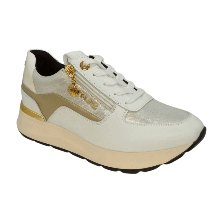 Sneakers donna 4US by Cesare Paciotti in pelle bianca e dettagli platino. Inserti in vernice in tinta e in tessuto effetto lamé silver. Chiusura con lacci piatti in cotone in tinta e zip sul laterale esterno. Linguetta e talloniera logate, spoiler posteriore cromato oro. Sottopiede morbido in pelle, fondo gomma ultra light altezza 3.5 cm