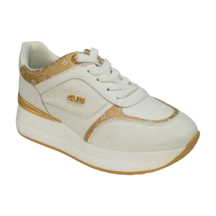 Sneakers donna 4US by Cesare Paciotti in ecopelle bianca e dettagli rosegold. Inserti laterali in bright mesh e mini logo metallico oro. Chiusura con lacci piatti in cotone in tinta, linguetta e talloniera logate. Spoiler posteriore cromato oro, sottopiede morbido in pelle. Fondo platform in gomma altezza 4 cm.