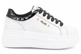 Sneakers donna 4US by Cesare Paciotti in pelle bianca con dettagli in vernice a contrasto neri. Chiusura con lacci piatti in cotone a contrasto con strass e mini logo metallico laterale oro. Linguetta logata, sottopiede morbido in pelle. Fondo platform in gomma logato altezza 6 cm.