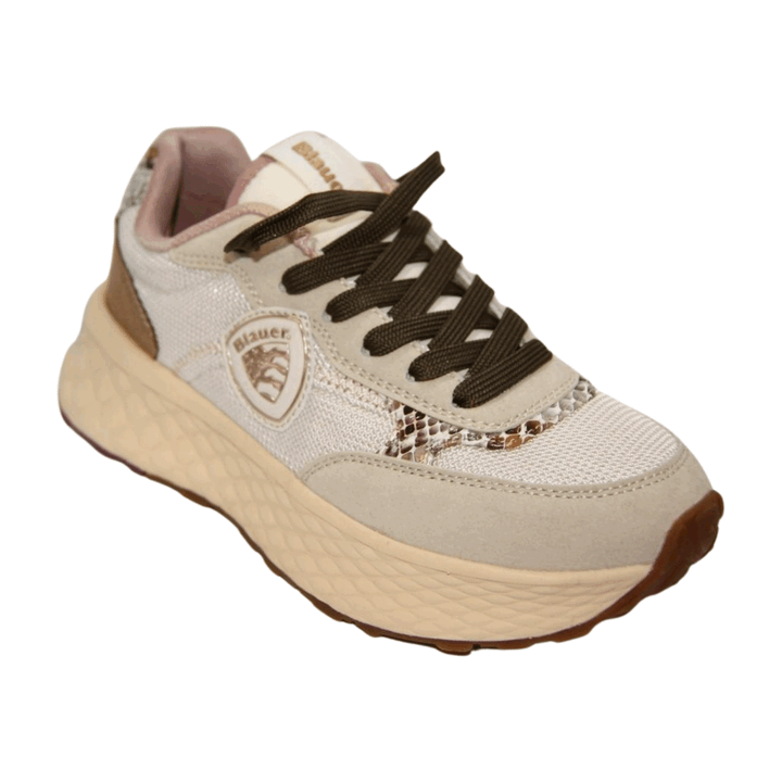 Sneakers donna Blauer multicolor in bright mesh con inserti in pelle. Talloniera rinforzata con logo e dettaglio pitonato, linguetta logata e patch logo laterale. Chiusura con lacci piatti in cotone a contrasto, sottopiede morbido. Fondo gomma leggero altezza 5 cm.