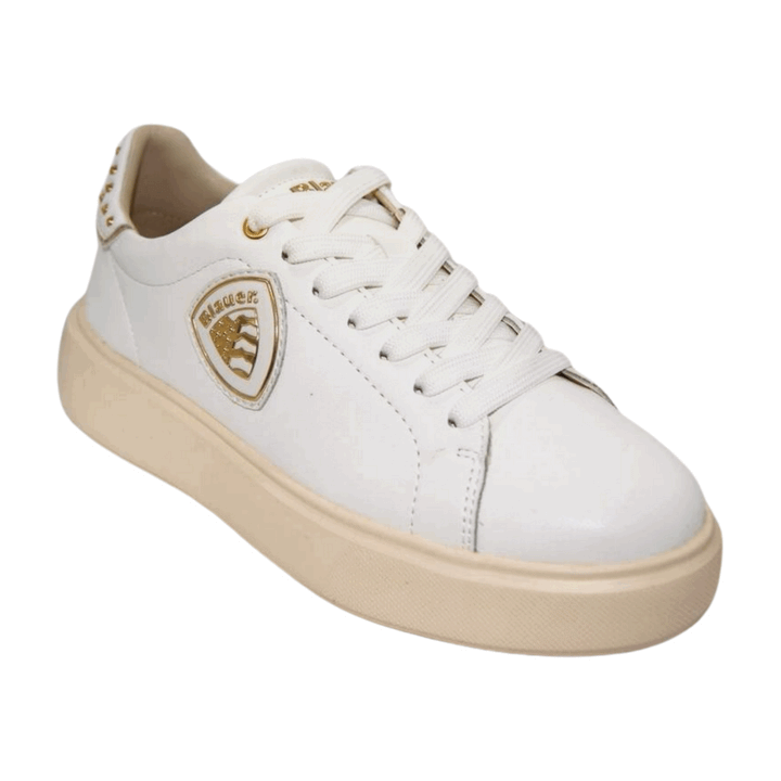 Sneakers donna Blauer in pelle total white. Talloniera con logo e applicazione mini borchie gold, linguetta logata e patch logo laterale. Chiusura con lacci piatti in cotone in tinta, sottopiede morbido. Fondo gomma leggero altezza 4 cm.