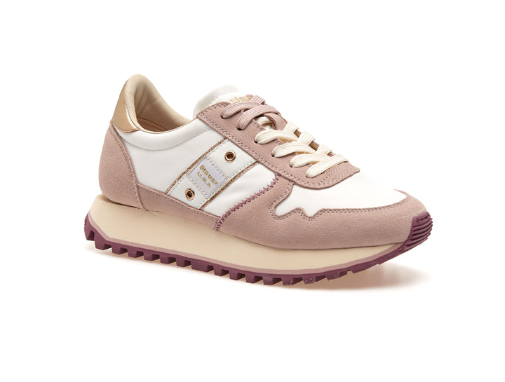 Sneakers donna Blauer in pelle e tessuto bianca con inserti in camoscio nude. Patch laterale dettagli glitter oro con logo, talloniera linguetta logate, chiusura con lacci piatti in cotone. Fondo gomma bicolor altezza 3 cm con battistrada dentellato a contrasto.