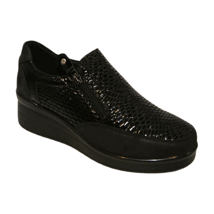 Sneakers donna Cinzia Soft in ecopelle e vernice total black effetto pitonato. Chiusura con zip sul laterale esterno e inserto elastico sul laterale interno. Plantare estraibile comfort foam, fondo zeppa in gomma antiscivolo altezza 4.5 cm
