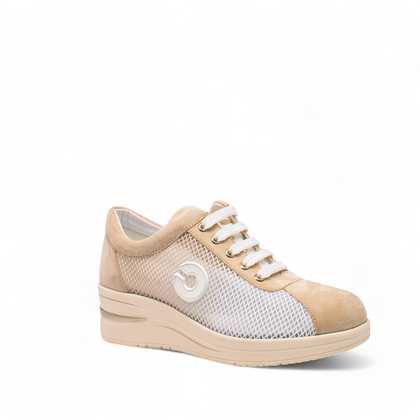 Sneakers donna Cinzia Soft in camoscio beige e mesh avorio con logo laterale in rilievo. Chiusura con lacci piatti in cotone a contrasto, sottopiede in pelle comfort foam. Fondo zeppa in gomma altezza 5 cm.