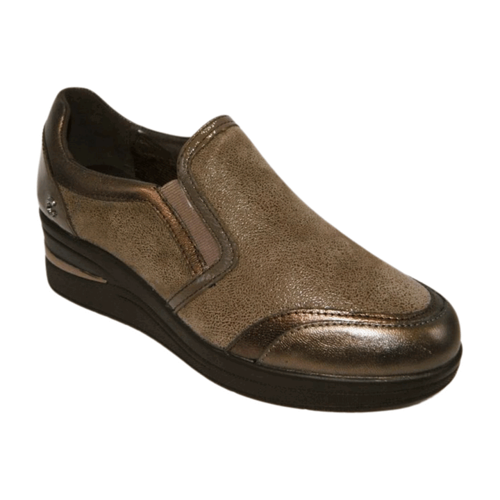 Sneakers donna slip-on Cinzia Soft in pelle effetto lamé e vernice color visone, con doppio inserto elastico laterale. Plantare estraibile in pelle memory foam, fondo zeppa in gomma antiscivolo altezza 4.5 cm