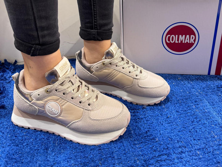 Sneakers donna Colmar in pelle scamosciata nude e mesh pink, inserti in nylon lucido e nylon metallizzato. Logo gommato in rilievo sul laterale, chiusura con lacci piatti in cotone in tinta. Sottopiede in comfort foam, etichetta con logo sulla linguetta. Suola platform bicolor, fondo gomma altezza 4 cm, battistrada dentellato.