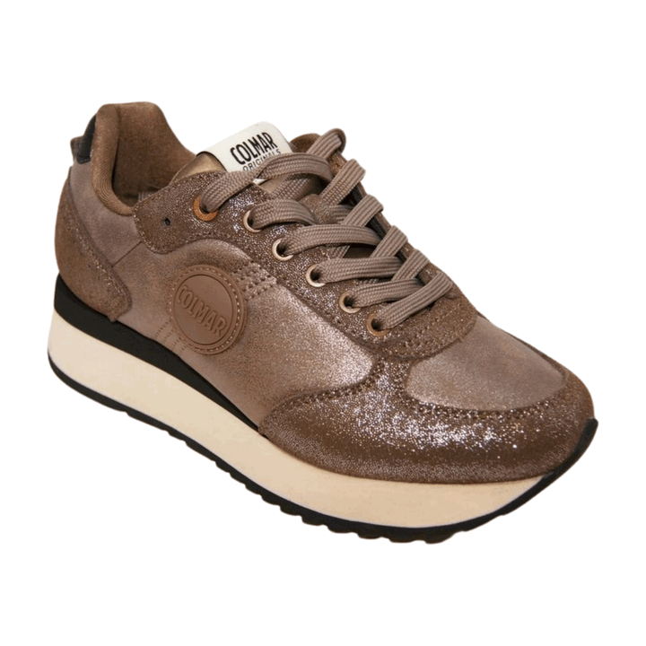 Sneakers donna Colmar in pelle scamosciata color tortora effetto glitter e inserti in pelle microfibra metallizzata. Logo gommato in rilievo sul laterale, chiusura con lacci piatti in cotone in tinta. Sottopiede in comfort foam, etichetta con logo sulla linguetta. Suola platform bicolor, fondo gomma altezza 4.5 cm, battistrada dentellato.